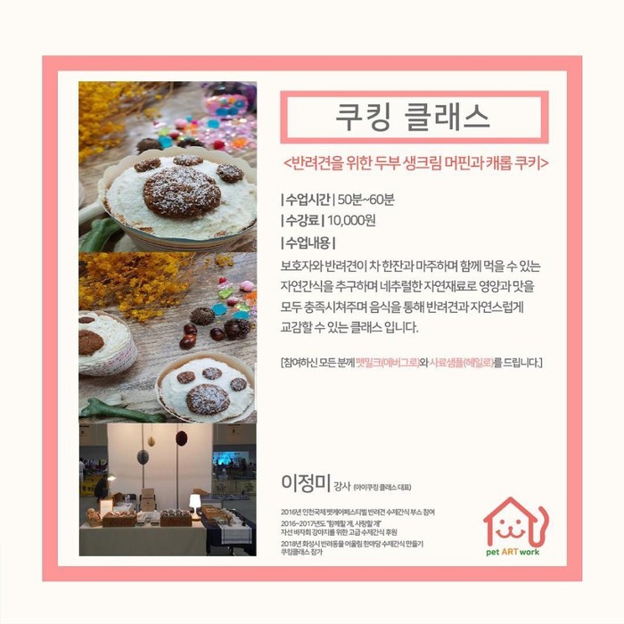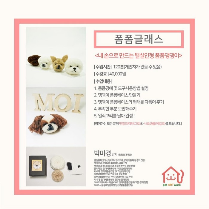 폼폼클래스에서는 반려동물의 얼굴을 똑 닮은 털실인형을 만들 수 있으며 쿠킹클래스에서는 반려동물이 맛있게 즐길 수 있는 두부 생크림 머핀과 캐롭쿠키를 만들 수 있다.