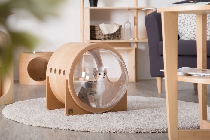 '마이주 우주선 하우스' 는 원형의 원목 본체와 넓은 아크릴 창으로 이루어져 있어 영구적으로 사용할 수 있을 뿐 아니라 고양이와 집사 모두에게 기쁨을 준다.