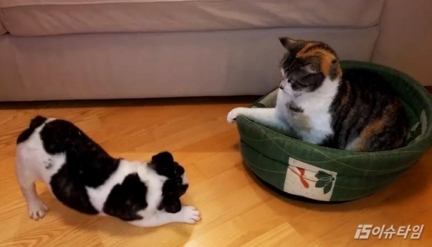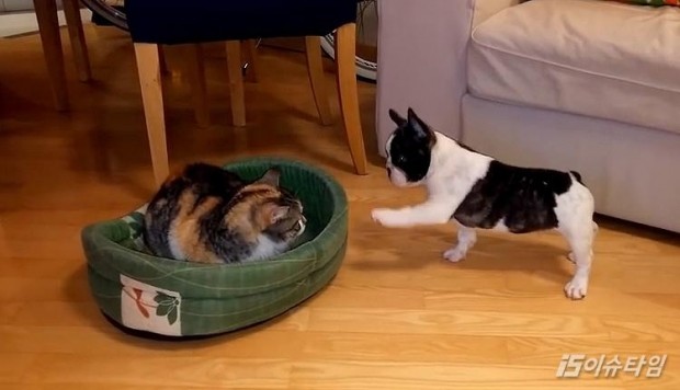 (이슈타임)임윤경 기자=귀여운 강아지 동영상 두 개가 유튜브에서 인기를 얻고 있다. 먼저 Puppy attempts to reclaim bed from cat 이라는 제목의 동영상은 자신의 집을 빼앗은 고양이에게서 다시 집을 돌려받기 위해 애쓰는 강아지의 모습이 담겨 있다. 동영상 속의 강아지는 자기 집을 다시 빼앗기는 해야 하면서도 고양이가 무서워 앞발로 건드려 보거나 잔뜩 긴장한 채로 집을 입으로 옮기는 등 소심하게 여러 가지 시도를 해본다. 하지만 고양이는 구경 난 듯 꿈쩍도 안 하고, 결국 집 주인 강아지는 두 손 두 발 다 들고 떠나게 된다.