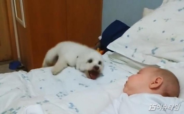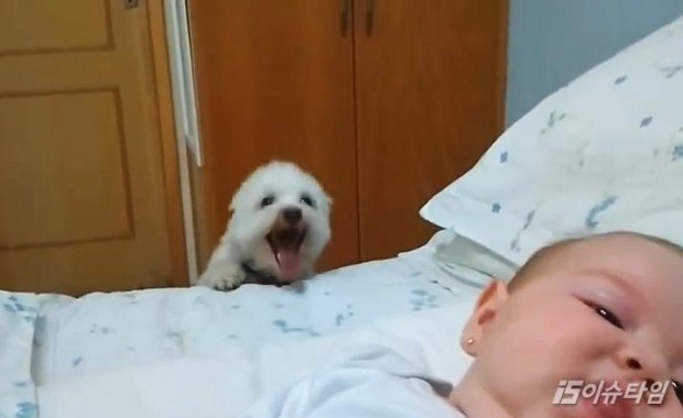 새로 태어난 아기가 신기한 듯 강아지가 높은 침대 위로 점프해 바라보고 있다. [사진출처=유튜브 동영상 캡처]