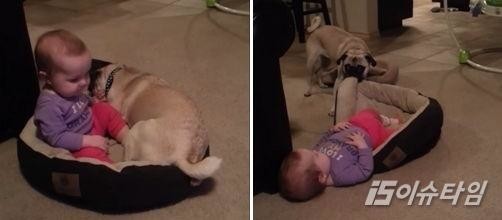 강아지 침실을 차지하기 위한 강아지와 아기가 신경전을 벌이고 있다.[사진=유튜브 영상 캡처]