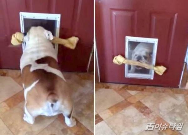 개구멍 보다 큰 사이즈의 개껌을 운반하기 위해 고군분투하는 불독.[사진=유튜브 영상 캡처]