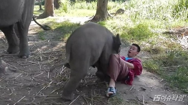 자신의 무게는 생각하지 않고 사람의 품에 안겨 뒹구는 코끼리의 모습