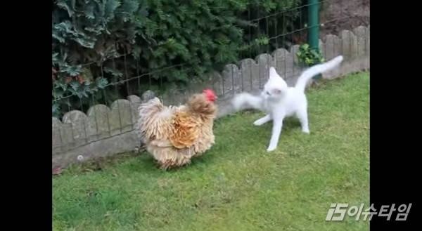 (이슈타임)이지혜 기자=암탉에게 결투를 신청한 아기 고양이 영상이 관심을 모으고 있다. 유튜브에 올라온 이 영상은 제 몸집만한 암탉을 향해 쉼 없이 결투를 신청하는 고양이의 모습이 담겨 있다. 고양이의 손짓 공격에 암탉은 아랑곳하지 않고 피하기만 한다. 그러다가 고양이가 방심하는 틈을 노려 반격을 가한다. 유유히 돌아서는 암탉을 고양이는 놓치지 않고 따라가다가 다시 빈틈을 노리고 공격한다. 하지만 결국 무대응으로 일관하는 암탉에 고양이는 백기를 들고 만다.