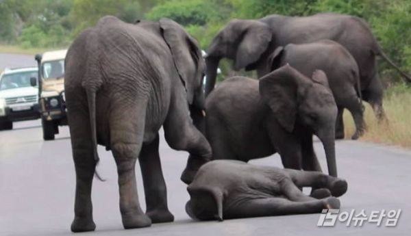 (이슈타임)백민영 기자=코끼리 가족이 도로에 퍼진 새끼 코끼리를 일으키는 영상이 올라와 화제다. 영국 데일리메일은 지난 27일(현지시간) 도로 한가운데 쓰러진 아기 코끼리를 일으키는 코끼리 가족의 모습이 담긴 영상을 공개했다. 영상에서는 도로를 지나던 새끼 코끼리 한 마리가 슬그머니 도로에 눕는 모습이 찍혔다. 같은 길을 지나가던 코끼리들이 발로 치며 일어나라고 하지만 아기코끼리는 일어날 생각을 하지 않는다. 엄마 코끼리의 끈질긴 발길질 덕분에 아기 코끼리는 결국 도로 바깥으로 걸어나간다. 영상은 접한 누리꾼들은 "귀엽고 사랑스러운 아기코끼리네!","코끼리 가족의 반응이 재밌다" 등의 반응을 보였다.