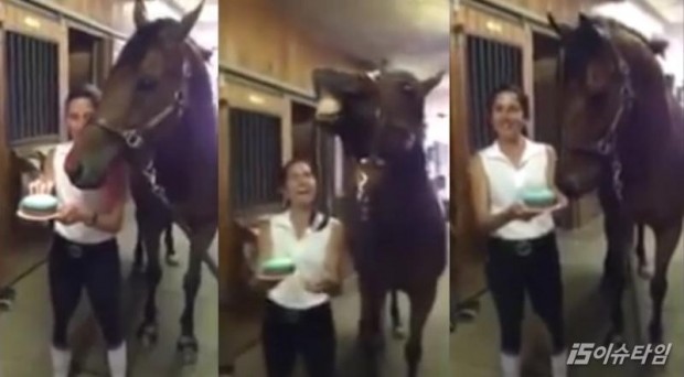 (이슈타임)김미은 기자=생일을 맞이한 말이 스스로 케이크 촛불을 끈 뒤 환한 잇몸 미소를 지어 큰 웃음을 안기고 있다. 지난 28일 유튜브에는 4살 된 말 'JD'의 생일파티 영상이 올라왔다. 미국 뉴저지(New Jersey) 주 이실리엔(Ithilien)의 한 마구간에서 JD의 생일을 축하해 주기 위해 주인인 제시카 워커(Jessica Walker)와 친구들이 모였다. 제시카와 친구들은 JD가 가장 좋아하는 민트 초코 아이스크림 케이크를 들고 '생일 축하송'을 부르기 시작한다.