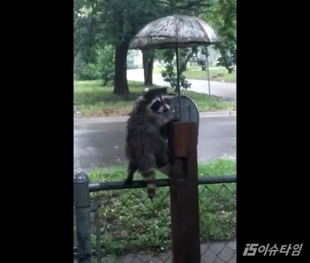 [펫이슈]우체통 우산 아래서 비 피하는 '웃픈' 너구리(영상)