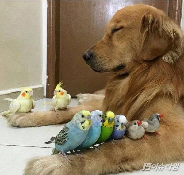 (이슈타임)백민영 기자=3대 천사견으로 유명한 골든 리트리버는 그 성격이 좋은 것으로 유명하다. 순종적이며 성격도 유순해 많은 사람들에게 큰 사랑을 받는 반려견 중 하나다. 푸들, 진돗개와 더불어 3대 천사견으로 불리기까지 한다. 최근 해외 온라인 커뮤니티에 다시 한 번 골든 리트리버의 유순함이 잘 드러나는 사진이 올라왔다. 골든 리트리버는 눈을 감고 가만히 앉아 있었다. 하지만 앞발 위에 앵무새들이 열을 맞춰 올라와 휴식을 취하는 것을 볼 수 있다. 새 친구들이 편안하게 쉴 수 있도록 자신의 신체를 내어준 것이다. 사람뿐만 아니라 다른 동물까지 배려하는 골든 리트리버의 모습에 누리꾼들의 입가에는 웃음이 멈추질 않았다.