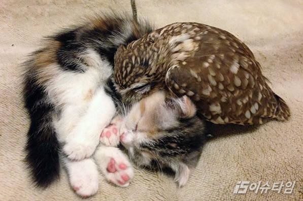 (이슈타임)백민영 기자=아기 올빼미와 고양이의 다정한 모습에 일본 누리꾼들이 심장을 가격 당했다. 온라인 미디어 보어드판다는 지난 2일(현지시간) 아기 고양이 마리모와 올빼미 후쿠의 일상이 담긴 사진을 공개했다. 사진에는 푹신한 털을 베개 삼아 서로에게 몸을 의지한 채 잠을 자고 있는 마리모와 후쿠의 모습이 담겨 있었다. 흔히 '꾹꾹이'라 불리는 발바닥을 내보인 채 잠든 마리모와 그런 마리모의 곁을 한치도 떨어지지 않으려는 후쿠의 모습은 보는 이들로 하여금 입가에 미소를 짓게 만들었다. 한편 이 귀여운 두 절친은 일본의 한 커피숍에서 함께 지내며 일본 뿐 아니라 전 세계적으로 엄청난 사랑을 받는 중이다.