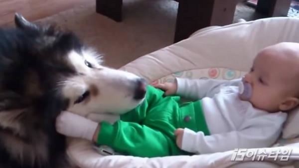 (이슈타임)백민영 기자=4개월된 아기가 엄청난 크기의 반려견과 놀고 있는 영상이 올라와 눈길을 끌었다. 지난 2일 유튜브에는 요람에 싸인 4개월 아기를 다정하게 돌보는 반려견의 모습이 올라왔다. 영상 속 아기는 요람에 누운 채 자기 발치에 놓인 커다란 반려견의 얼굴을 발로 쓰다듬으며 장난치고, 반려견은 아기의 발을 혀로 핥는다. 아기는 알래스칸 맬러뮤트의 장난에도 무서워하기보다 발을 오므렸다 폈다 하며 즐거워하는 모습을 보였다. 한편 반려견과 아기의 훈훈한 우정에 누리꾼들의 입가에는 미소가 번졌다.