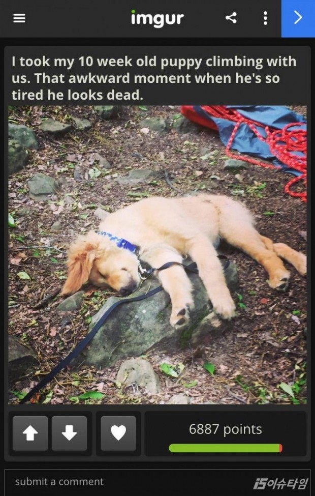 (이슈타임)권이상 기자=태어난 지 10주된 어린 강아지가 주인과 함께 등산에 갔다가 너무 피곤해서 '기절'한 사진이 온라인을 뜨겁게 달구고 있다. ' 지난 15일 한 누리꾼은 사진 공유 온라인 커뮤니티 imgur에 너무 귀여운 사진 2컷을 공개해 폭발적인 반응을 얻고 있다. ' 이 누리꾼은 가족과 함께 등산에 나섰는데 집에 있는 어린 반려견을 데리고 트레킹에 나섰던 것이다. ' 어린 강아지는 산에 왔다는 즐거움에 신나게 뛰어다닌 탓에 체력이 바닥나서 그만 길바닥에 쓰러져 졸도하고 말았다. 주인은 이런 모습이 너무 귀여워 사진을 촬영해 온라인에 공유해 수많은 이들의 입가에 미소를 짓게 했다. ' 하지만 주인은 생후 10주차에 기절했던 강아지가 지금 6개월이 됐는데 최근에는 전문 산악인 못지 않은 '위엄'을 자랑한다고 근황을 소개했다. ' 두 컷의 사진은 온라인 커뮤니티 등을 중심으로 많은 사람들을 '심쿵'하게 만들고 있다.