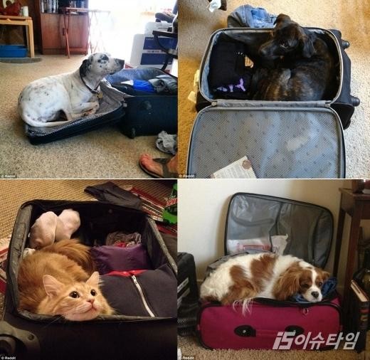 (이슈타임)김현진 기자=주인들의 여행을 가로막는 듯한 반려동물들의 사진이 공개되면서 사람들의 관심이 쏠리고 있다. 영국 일간 데일리메일은 28일(현지시간) 미국 최대 소셜사이트인 레딧닷컴을 통해 사람들이 올린 동물 사진들을 소개했다. 사진 속 동물들은 저마다 행동으로 주인의 여행이나 출장을 막으려 하는 모습이다. 여행 가방에 드러눕거나 짐 싸야 할 옷가지 위를 몸으로 막은 상태에서 애처로운 눈빛을 주인에게 발사하기도 한다. 짐 싸는 것을 막지 못한 어떤 개는 아예 자동차 트렁크 안에 들어간 모습이다. 물론 주인들 모두 자신의 사랑스러운 ‘아이‘를 다른 사람에게 맡기고 데려가지 못하는 상황이 더 아쉬울 수도 있다. 만일 당신이 동물 애호가라면 이처럼 주인과 떨어지기 싫어 표현하는 동물들의 깜찍한 행동을 사랑하지 않을 수 없을 것이다.