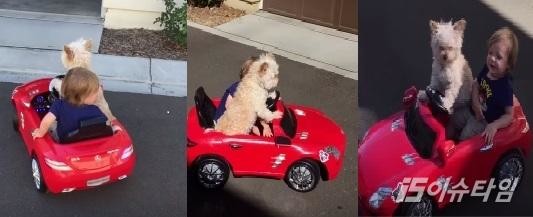펫 데이지 가 운전하며 함께 장난감 차를 탄 올리버 에 모습이다. [사진=온라인커뮤니티]