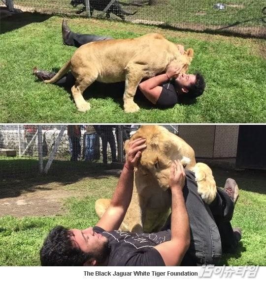 (이슈타임)김대일 기자=멕시코의 한 동물보호재단 보호소에 사는 암컷 사자 키아라, 이 사자는 최근 한 남자와 재회한 소식이 온라인 커뮤니티를 통해 전해졌다. 소식을 전한 남자는 키아라 에 사육사였다. 키아라를 어릴 때 먹여주고 돌봐줬던 아빠인것으로 확인됐다. 또 우리 밖의 남자를 본 키아라는 개처럼 낑낑되는 모습이 연출됐다. 남자가 문을 열고 들어올때. 사자는 남자를 앞발로 반갑게 안기는 모습이다. 둘은 바닥에 넘어져 뒹굴어 졌고 다시 사자는 사랑과 반가움을 마음껏 표현했다. 고마움 그리고 반가움을 표현하는 맹수의 모습에 많은 이들이 감동적이고 아름다운 모습 이라고 말한다. 키아라는 5분 이상, 자신을 돌봐준 이에게 반가움을 표시했다. 포옹을 멈추지 않을 기세였다.