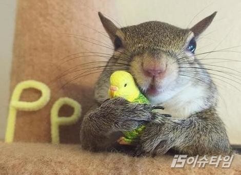 구조된 다람쥐가 앵무새 인형을 들고 앙증 맞은 포즈를 취하고 있다. [사진=온라인커뮤니티]