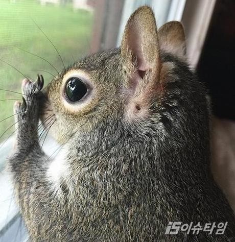새로운 가족을 찾게된 다람쥐 창문에서 밖을 바로 보고있다. [사진=온라인커뮤니티]
