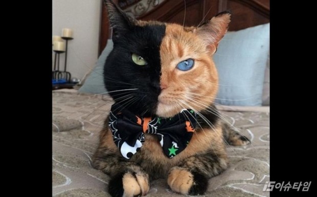 (이슈타임)박혜성 기자='마징가Z'의 등장인물 '아수라백작'과 같은 얼굴을 한 고양이가 있어 화제가 되고 있다. 지난 11일(현지시간) 영국 매체 데일리메일은 얼굴의 절반이 오렌지색, 나머지 절반은 검정색인 고양이 '비너스'에 대해 보도했다. 연필로 선을 그은 것처럼 반듯하게 둘로 나뉜 얼굴색을 지닌 이 고양이는 염색 등 인위적인 과정이 아닌 선천적으로 이런 얼굴을 가진 것으로 알려져 더욱 주목을 받고 있다. 특히 얼굴색이 다른 것처럼 눈 색깔도 달라 동물 전문가들도 관심을 가지고 있다. 미국 노스캐롤라이나에 사는 비너스의 주인은 '길거리에 버려졌던 유기묘인 비너스를 처음 데리고 온 것은 2009년이다'면서 '당시에도 비너스는 서로 다른 두 고양이를 합쳐 놓은 듯한 독특한 외모를 가지고 있었다'고 말했다. 이어 그는 '비너스의 얼굴 털을 염색했다거나 포토샵으로 편집한 것이 아니냐는 의심의 목소리가 있다는 것을 잘 안다'고 말하며 '하지만 이는 모두 100% 자연적인 것'이라고 설명했다. 비너스의 얼굴 양쪽의 털 색깔이 다른 이유는 정확히 밝혀지지 않았다. 하지만 전문가들은 비너스가 태어나기 전 어미의 뱃속에서 검은색 털을 나타나게 하는 유전자가 온 몸에 불규칙적으로 퍼진 반면, 오렌지색 털을 나타나게 하는 유전자는 몸의 특정 부위에서만 자리잡기 때문인 것으로 보고 있다. 한편 비너스는 다수의 미국 텔레비전 쇼와 내셔널지오그래픽 매거진 등에서 소개된 바 있으며, 주인이 만든 비너스의 페이스북 페이지는 무려 92만번의 좋아요를 받는 등 국제적인 인기를 끌고 있다.