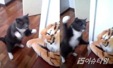 (이슈타임)김현진 기자=한 고양이가 호랑이 인형의 뺨을 수차례 때리는 영상이 공개돼 눈길을 끌고 있다. 13일(현지시간) 영국 매체 미러는 최근 온라인에서 화제가 되고 있는 '호랑이를 싫어하는 고양이' 영상을 소개했다. 공개된 영상속에는 탁자 위에 있는 호랑이 인형 앞에 고양이 한마리가 다가와 앉더니 호랑이 인형을 뚫어져라 쳐다봤다. 이내 고양이는 앞발을 날려 호랑이 인형의 뺨을 후려쳤다. 수차례 호랑이 인형의 뺨을 때리던 고양이는 반응없는 호랑이 인형이 재미없는듯 때리기를 잠시 중단했다. 하지만 곧 호랑이 인형의 얼굴을 다시 공격한다. 주인이 호랑이 인형을 고양이 쪽으로 스그머니 움직이는 장난을 치자 움찔 하면 뒷걸음을치는 고양이의 모습은 보는 사람들에게 웃음을 자아냈다. 영상이 공개되자 '누리꾼들은 '하룻강아지가 아니라 하룻고양이네' '그렇게 때렸으면서 왜 겁먹는거야' 등의 귀여워하는 반응을 보였다. '