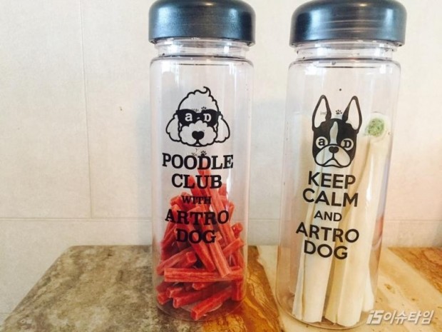 아트로독 에코보틀에 반려동물 간식과 껌을 넣어서 보관하기 좋다.[사진=이지혜 기자]