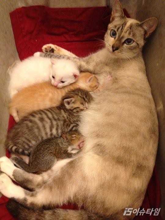 (이슈타임)이갑수 기자=새끼 다람쥐까지 함께 돌봐주는 어미 고양이의 사연이 알려져 눈길을 끌고 있다. 최근 영국 일간지 메트로 보도에 따르면 어미 고양이가 자신의 새끼와 함께 아기 다람쥐에게 젖을 나눠주는 사진이 온라인에 공개되면서 사람들의 관심을 끌었다. 사진 속 새끼 다람쥐는 어미 고양이 품속에서 눈을 감은채 젖을 빨고 있었다. 다른 새끼 고양이들과 허물없이 어울어지는 모습에 누가 고양이고 누가 다람쥐 인지 모를 정도다. 이 고양이 주인의 설명에 따르면 어미 고양이가 풀숲에서 어미를 잃은 것으로 보이는 아기 다람쥐를 데려와 보듬기 시작했다며 지극정성으로 돌보고 있는 중이라고 전했다. 누리꾼들은 "누가 고양이고 누가 다람쥐 인지 못알아 봤네" "귀엽다" 등의 반응을 보이고 있다.