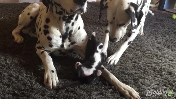 달마시안 강아지 두마리과 아기고양이 우노가 함께 장난을 치는 모습이 눈길을 사로잡고 있다.[사진=유투브 영상 캡쳐]