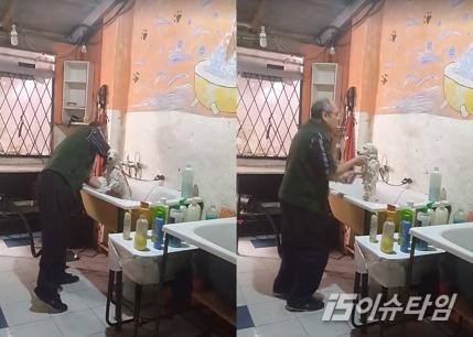 강아지를 목욕시키면서 즐거워하는 미용사의 모습이 담긴 영상이 화제다.[사진=온라인 커뮤니티]