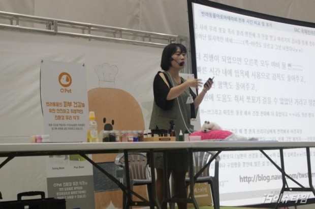 펫케어페스티벌에서 국제반려동물 아로마테라피 성지유 협회장이 아로마테라피에 대해 강의하고 있다.[사진=김현진 기자]