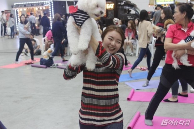 (이슈타임)김현진 기자=반려동물 웰빙을 주제로 개최된 '2016 인천 국제 펫케어페스티벌'에서는 반려견과 함께하는 도그요가 프로그램이 진행돼 관람객들의 눈길을 끌었다. 2일 펫케어페스티벌에서는 윤정원 강사가 반려견과 함께 할 수 있는 도그요가를 시연했다. 사전신청을 통해 도그요가를 함께할 10여명의 참가자도 함께 했다. ' 윤 강사는 도그요가에 대해 '강아지에게 유대감 극대화하고 건강한 느낌으로 소통할 수 있다'며 '오늘 불안감이나 눈치를 많이 보는 강아지 들을 차분하게 만들어주는 도그 마사지를 알려드리겠다'고 말했다. 윤정원 강사가 직접 만든 라벤더크림을 참가자에게 제공해 오감을 만족시킬 수 있는 도그 마사지를 소개했다. 반려견의 얼굴과 몸 등을 마사지해주자 낯설어하는 강아지들도 있었지만 편안하게 즐기는 반려견의 모습을 보였다. 이어 반려견과 함께 하는 도그요가도 선보였다. 심장과 심장이 가까이 맞닿을 수 있도록 하는 도그요가를 통해 반려견과 보호자가 서로 교감할 수 있도록 도왔다. 함께 도그요가에 참여한 한 관람객은 '도그요가라고해 호기심에 신청하게 됐는데 요가 자세가 힘들긴 했지만 반려견과 함께 할 수 있어 좋은 시간이었다'고 소감을 전했다. '