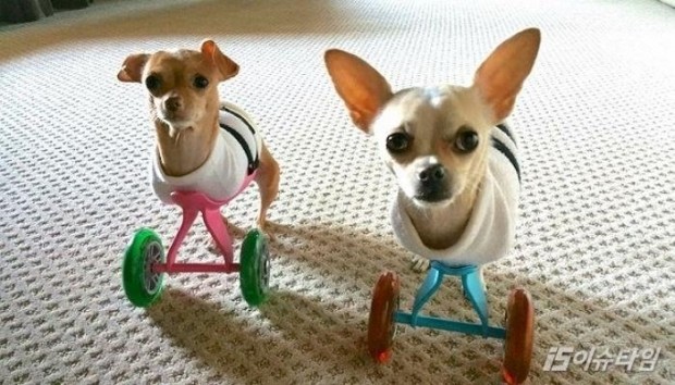 (이슈타임)강보선 기자=두 다리 없이 태어난 장애 강아지를 입양해 휠체어를 만들어주는 등 자식처럼 키우는 부부의 사연이 전해져 감동을 전하고 있다. 지난 18일(현지시간) 동물 전문매체 더도도에 따르면 지난 2013년 미국의 테레즈 부(Therese Vu) 둑 트란(Duc Tran)부부는 지난 2013년 두 다리가 없는 치와와 캉가(Kanga)와 루(Roo)를 입양했다. 근친 교배 부작용으로 두 다리 없이 태어난 캉가와 루는 미국 조지아 주의 한 동물 보호소(Angels Among Us)에 맡겨졌다. 장애탓에 쉽게 입양되지 않아 수개월동안 보호소에 있어야 했다. 강아지를 입양시킬 생각이 있었던 테레즈 부부는 우연히 이 보호소의 홈페이지는 보다 치와와 남매의 사진을 보고 한 눈에 반했다. 그리고 곧장 보호소로 가 치와와 남매를 입양했다. 테레즈는 캉가와 루를 입양해 와 두 강아지가 집안을 자유롭게 돌아다닐수 있도록 집안 이곳저곳에 담요와 매트를 깔아줬다. 또 두 다리에만 의존해 살아야 하는 캉가와 루를 위해 의족을 제작하는 친구에게 특별히 부탁해 두 강아지를 위한 휠체어를 제작했다. 테레즈는 "16년 간 키우던 반려견 두 마리가 세상을 떠나 많이 힘들었는데, 귀여운 캉가와 루를 만나면서 우리 부부 역시 활기를 되찾았다"며 "우리가 녀석들에게 준 것보다 치와와 남매에게 우리가 얻는 행복감이 더 크다"고 말했다. 휠체어로 두 다리를 더할 것이 생긴 치와와들은 온 집안을 누비며 행복한 생활을 하고 있다.