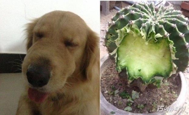 (이슈타임)강보선 기자=주인이 자리를 비운 사이 선인장을 베어먹고 얼굴이 퉁퉁 부은 강아지의 사연이 전해졌다. 지난 2일(현지 시간) 중국 SNS 웨이보 '멍멍이 일기'에는 주둥이 쪽이 퉁퉁 부어있는 강아지의 사진이 누가 한입 베어 문듯한 선인장의 사진과 함께 올라왔다. 계정 관리자는 '주인이 퇴근하고 집으로 돌아와 퉁퉁 부은 강아지 얼굴을 발견했다'며 '가장 유력한 범인은 선인장'이라고 전했다. 함께 올라온 선인장 사진을 보면 누가 사과를 한입 베어문 것처럼 일부분이 사라지고 없다. 해당 강아지의 사진과 선인장 사진은 7000번 넘게 공유되며 2만개가 넘는 '좋아요'를 받았다.