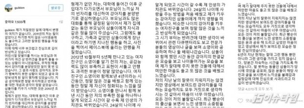 (이슈타임)김대일 기자=유튜브 인기커플로 알려진 '소근커플'에 김근명씨가 과거 반려견 학대 논란에 대해 사과했다. 지난 14일 김씨는 자신의 인스타그램에 '제가 저질렀던 일에 대하서 변명의 여지가 없습니다'라며 '2011년의 저는 철이 없었다고 하기엔 적지 않은 나이였음에도 불구하고 그러한 잘 못된 행동을 저질렀습니다'라고 말을 시작했다. 이어 '어린시절 반려견을 충분히 돌볼 수 있는 상황이 아니었음에도 무작정 떼를 써서 강아지를 분양받았던 일이 몇번 있었습니다'라며 '결국 사람도 강아지도 모두가 행복하지 못한 상황이 되었고 결국 파양보내게 된 일이 몇차례 있었습니다'라고 밝혔다. 또 김씨는 '대학에 들어간 이후 군입대가 다가오면서 부모님이 느끼실 저의 빈자리를 대신하여 강아지를 분양받기로 결심했습니다. 제가 집에 없는 동안 부모님이 삼돌이에게 자식과 같은 정을 많이 주었습니다'라고 말하면서도 '그럼에도 불구하고 가족과 같았던 삼돌이에게 장난이라고 하기엔 지나친 행동을 하고 사진을 찍어서 페이스북에 올리는 만행을 저질렀습니다'라고 말했다. '