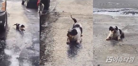 "빙판 위에서 일어서려는 강아지를 촬영했다"