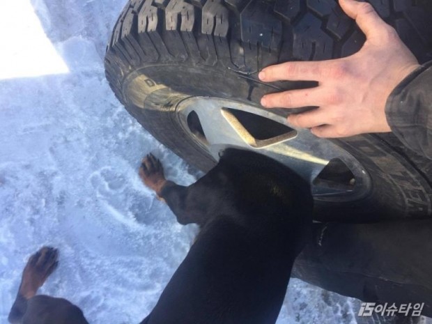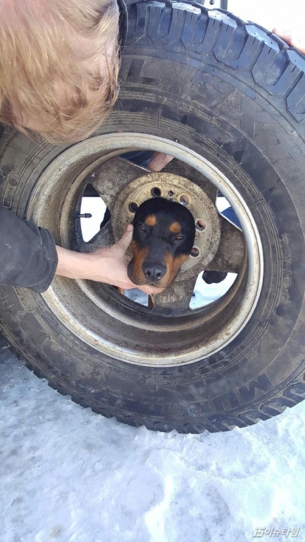 타이어 휠에 머리가 낀 강아지 사연이 공개돼 눈길을 끌고 있다.[사진=The dodo]