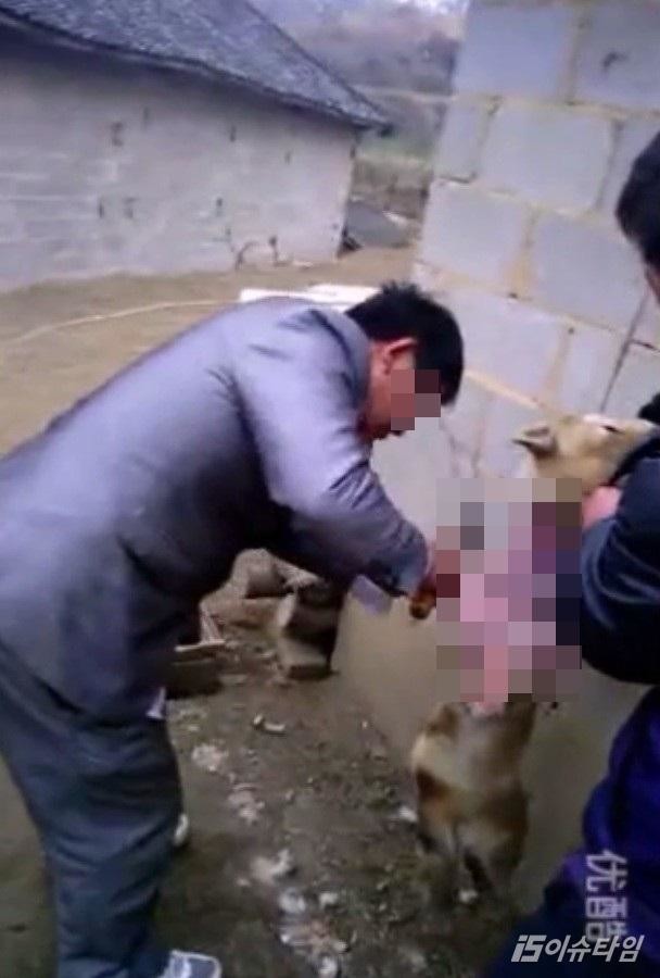 중국에서 산채로 개의 가죽을 벗기는 사진이 공개돼 논란이 됐다.[사진=The coverage]