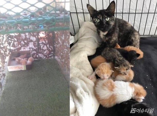 고양이 새끼 6마리가 발견된 곳(사진 왼쪽)에서 어미 고양이를 기다려 함께 보호소로 이동했다(사진 오른쪽)[사진=The kitten cottage]