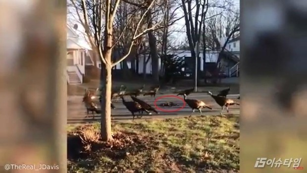 (이슈타임)이유나 기자=길가에 죽은 고양이 주위를 떼 지어 맴도는 칠면조의 영상이 온라인에서 화제를 모으고 있다. 지난 2일(현지시간) ABC뉴스 등 외신은 미국 매사추세츠 주 랜돌프에서 수십 마리의 칠면조가 죽은 고양이 주위에서 원을 그리며 도는 모습이 담긴 영상을 공개했다. 공개된 영상 속에는 길 한복판에 죽은 것처럼 보이는 고양이 주위로 칠면조 수십 마리가 원을 그리며 반복해서 맴돈다. 영상을 촬영한 조너선 데이비스는 자신의 트위터에 "이 칠면조들은 죽은 고양이에게 10번째 삶을 주기 위한 행동을 하고 있다"는 글과 함께 영상을 공개했다. 고양이 목숨은 9개라는 속설을 염두에 두고 한 말로 보인다. 코넬 조류 연구소 연구원들은 영상을 보고 "칠면조들은 죽은 고양이를 위협적 존재로 판단해 이런 행동을 한 것"이라며 "까마귀나 다른 조류들이 부엉이에게 단체 행동을 하는 것과 비슷하다고 볼 수 있다"고 말했다. 캘리포니아대학의 행동생태학자인 앨런 크라카우어는 "가끔 먹이사슬이 낮은 동물이 높은 동물에게 다가가는데, 이 행동으로 높은 동물들을 내쫓는 데 도움이 되기 때문에 칠면조들도 비슷한 행동을 보였을 확률이 높다"고 말했다. "
