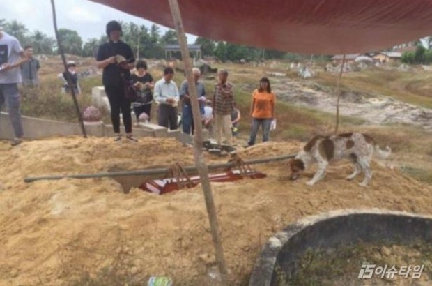 주인의 장례식장에 참석한 반려견 보비는 묘지 주위에 자리잡고 앉아 떠나지 못했다.[사진=Leong Khai Wai facebook]