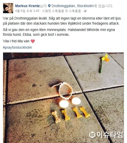 스웨덴 트럭 테러로 희생된 개를 기리는 SNS가 퍼지면서 추모행렬이 이어지고 있다.[사진='Markus Krantz' facebook'캡처]