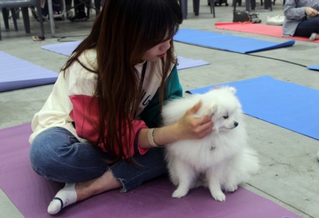 관람객이'도그요가에 참여해 반려견에게 마사지를 해주고 있다.[사진=김담희 기자]