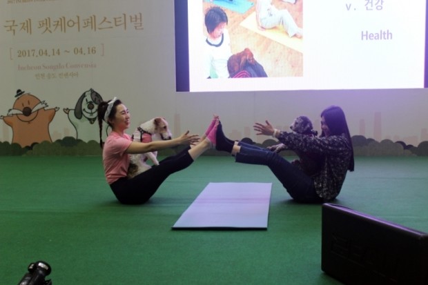 (이슈타임)김담희 기자=윤정원 강사가 15일 펫케어페스티벌에 참여해 반려견과 함께할 수 있는 도그요가를 선보였다. 이날 윤정원 강사의 도그요가는 사전 공지를 통해 선착순으로 참가자를 뽑아 진행됐다. 당일 불참석자의 자리는 현장에서 신청자를 받아 참여할 수 있도록 했다. 윤정원 강사는 반려견과 함께 요가를 하는 동안 반려견과 보호자의 건강은 물론 유대감을 높힐 수 있다며 시범을 시작했다. 이어진 요가 수업에서는 반려견의 장건강과 호르몬 분비에 좋은 '비행기 자세', 견주에게는 몸의 발란스를 반려견에는 재미를 주는 '발란스 포즈' 등 반려견과 함께할 수 있는 재미난 포즈들을 선보였다. 또 윤 강사는 참가자중 한 명을 무대로 초대해 커플 도그요가를 선보이기도 했다. 그는 요가 프로그램에 소형견들이 많이 참여한 것과 관련해 소형견들이 쉽게 겪는 슬개골 탈구에 좋은 마사지를 소개하기도 했다. 한편 펫케어페스티벌은 반려동물의 올바른 문화 정착을 위한 축제로 14일부터 16일까지 3일간 송도 인천 컨벤시아에서 진행된다. '