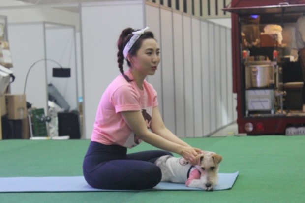 윤정원 요가강사가 반려견과 함께할 수 있는 요가 동작에 대해 알려줬다.[사진=김담희 기자]
