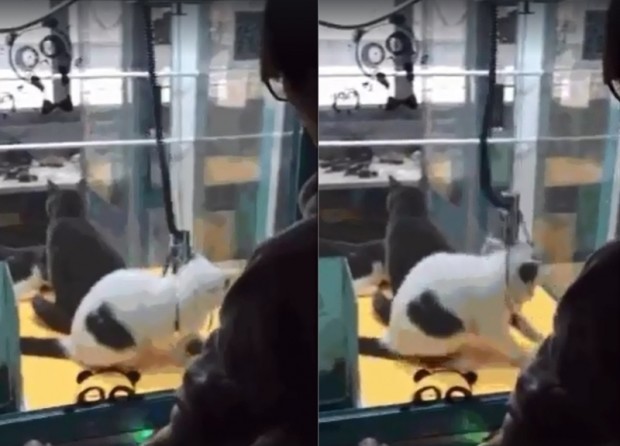 인형뽑기 안에 있는 고양이를 뽑으려는 한 남성의 모습이 온라인에 영상으로 올라와 논란이 됐다.[사진=온라인 커뮤니티]