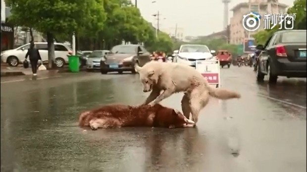 중국의 한 도로 위에서 죽은 친구를 떠나지 못하는 개의 모습이 주위를 안타깝게 했다.[사진=Musaddaq Ghani Mughal Youtube]