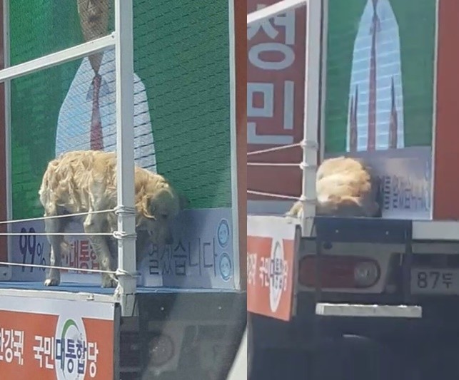 (이슈타임)김담희 기자=선거 유세 차량 뒤에 강아지가 위험하게 타고 있는 영상이 공개돼 논란이 됐다. 29일 오후 1시쯤 광주광역시의 한 도로에서 운전자의 블랙박스 영상이 공개됐다. 해당 영상에는 선거 유세 차량 뒤에 손질이 제대로 안된 대형견이 타고 있다. 강아지는 트럭의 좁은 공간에서 어쩔줄 모르는 모습이다. 해당 트럭은 선거 영상을 잘보이게 하기 위해 주변을 다 트이게 만들어 강아지를 태우고 달리는 모습이 아슬아슬하게만 느껴진다. 영상을 본 사람들은 만일 급정거라도 했다간 강아지가 도로 위로 떨어질 것 같다며 마음을 졸였다. 또 경적소리가 차량 소리에 강아지가 스트레스 받을 것을 우려했다. 이후 국민대통합당 측은 페이스북을 통해 "무안에서 광주로 향하던 중 개를 데리고 있는 할머니가 집에 까지 태어달라고 부탁했고 기사분은 좋은 뜻으로 응했다"며 "(차량 내부에)개를 태울 공간이 없어 할머니께 양해를 구하고 적재함 부분에 안전조치 없이 태우는 실수를 범하게 됐다"고 해명했다. "