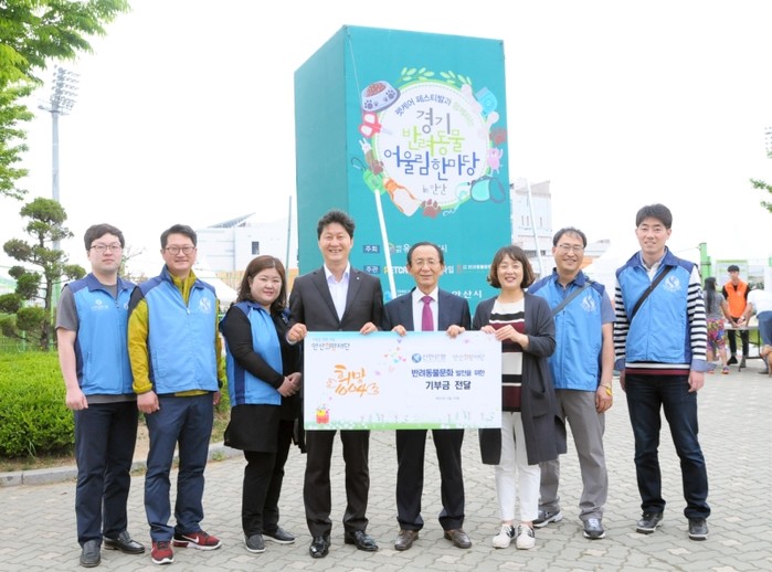 신한은행과 (사)안산희망재단이 반려동물 문화발전을 위한 기부금을 (사)반려동물 참문화협회에 전달했다.[사진=김희영 기자]