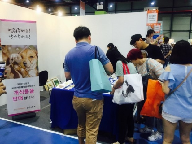 (이슈타임)김담희 기자=지난 1일부터 2일까지 서울 강남구 SETEC에서 진행된 '케이캣페어'에서 개 식용을 반대하는 서명 운동이 전개됐다. (사)반려동물참문화협회와 야옹이 신문이 주최한 이번 캠페인은 식용을 위한 개농장를 반대하고 개를 식용으로 생각하는 인식을 변화하자는 취지에서 열렸다. 최근 정의당 이정미 의원이 발표한 '식용 개농장 실태조사' 자료에 따르면 전국에 18평 이상 식용 개농장이 2862개로 최소 78만 마리의 개가 식용으로 사육되는 것으로 알려졌다. 이들 개농장에는 분뇨가 가득한 우리에 개를 가두고 음식쓰레기를 먹이는 등 위생상태에 대한 논란이 끊이지 않고 있다. 비위생적인 유통뿐만 아니라 개를 식용의 존재로만 생각하는 인식으로 인해 누군가에겐 가족이나 다름없는 반려견을 훔쳐 잡아먹는 사건이 발생하고 있다. 지난 2월 경상남도 창녕군에서는 택시기사가 실종된 반려견을 잡아가 개소주로 만든 사건이 발생해 공분을 샀다. 앞서 지난해 9월 전북 익산에서는 실종된 대형견 잉글리쉬쉽독을 인근 마을 주민 4명이 트럭에 싣고 가 마을회관에서 도살해 고기 40kg을 나눠가진 사건도 있었다. 참문화협회 정판수 회장은 '삼복(三伏)이 다가오면서 여전히 몸보신을 위해 개고기를 찾는 사람들이 많다'며 '사람들에게 동물들의 생명을 존중하고 함께 행복하게 공존하기 위해선 반려동물을 키우는 사람뿐 아니라 키우지 않는 사람들의 인식도 변화돼야하기 때문에 서명운동을 진행하게 됐다'고 밝혔다. 한편 (사)참문화협회는 오는 9일 서울 시청광장에서 열리는 개식용 반대 축제 'STOP IT 2017'에도 참석할 예정이다.