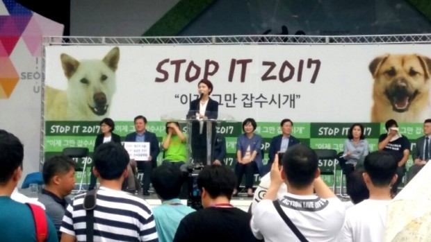 (이슈타임)신혜선 기자=초복을 며칠 앞두고 서울 시청광장에서 개 식용을 반대하는 캠페인이 진행됐다. 9일 서울 중구 서울시청 광장에서 'STOP IT 2017 개 식용 중단 캠페인'이 열려 동물보호단체뿐 아니라 환경단체와 수의사 등이 함께 자리했다. 이날 행사에는 행사에는 동물권단체 케어, 동물자유연대, (사)나비야사랑해, 반려동물 토탈케어 클로펫, 서울시 수의사회, 경기도 수의사회 등이 참석해 함께 뜻을 밝혔다. 정치권에서도 개고기 문제에 대해 관심을 드러냈다. 한정애 더불어민주당 국회의원과 신보라 자유한국당 국회의원은 이날 개막식 무대에 올라 개 식용 중단 캠페인 축사를 전했다. '