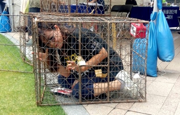 9일 서울 시청광장에서 개 식용 중단 캠페인에 참석한 한 관람객이 직접 우리 안에 들어보는 체험을 하고 있다.[사진=송윤희 기자]