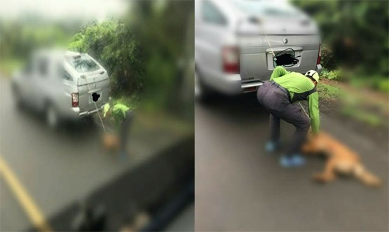 차 뒤에 반려견을 매달아 끌고다닌 70대가 경찰에 붙잡혔다.[사진=온라인 커뮤니티]