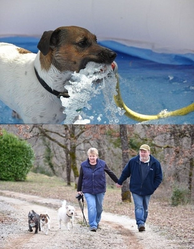 수영장 물이 채워지기 시작하자 세 마리의 반려견 중 막내인 그럽은 목이 무척 말랐는지 수영장에 뛰어들어 물을 마시기 시작했다.